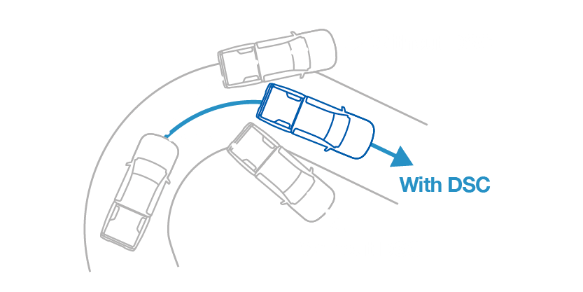 DSC with TCS electronically controls braking force applied to each wheel to help prevent understeer or oversteer and maintain vehicle stability when cornering on slippery road conditions.